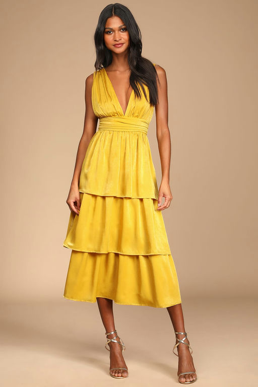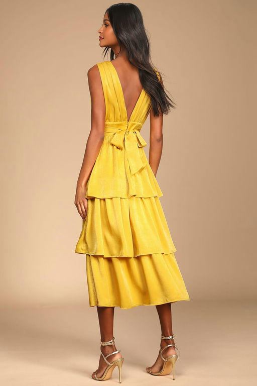 Peak Party Vibe Mustard Yellow Satin Tiered Tie-Back Midi Dress