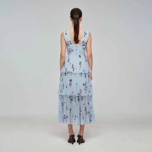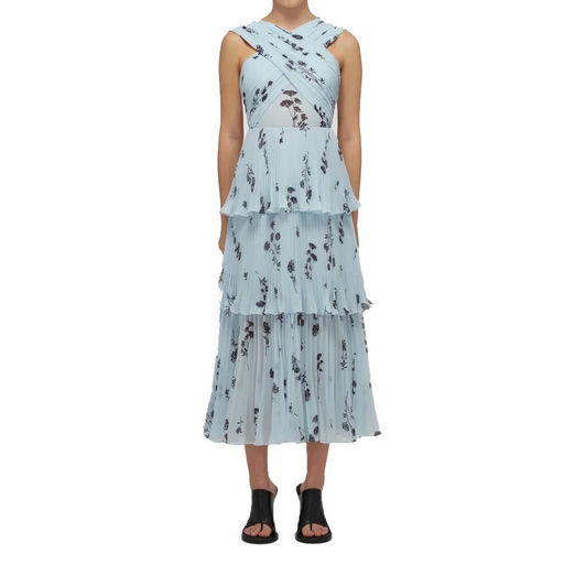 Blue Floral Silhouette Chiffon Crossover Midi Dress