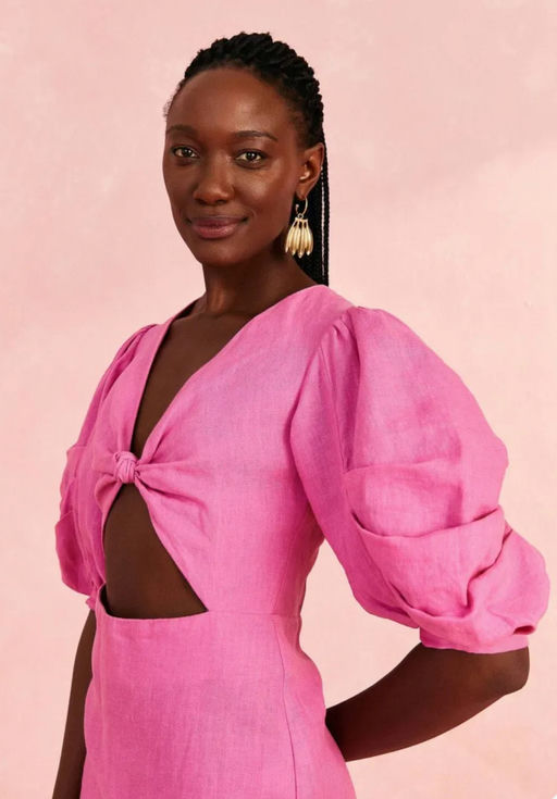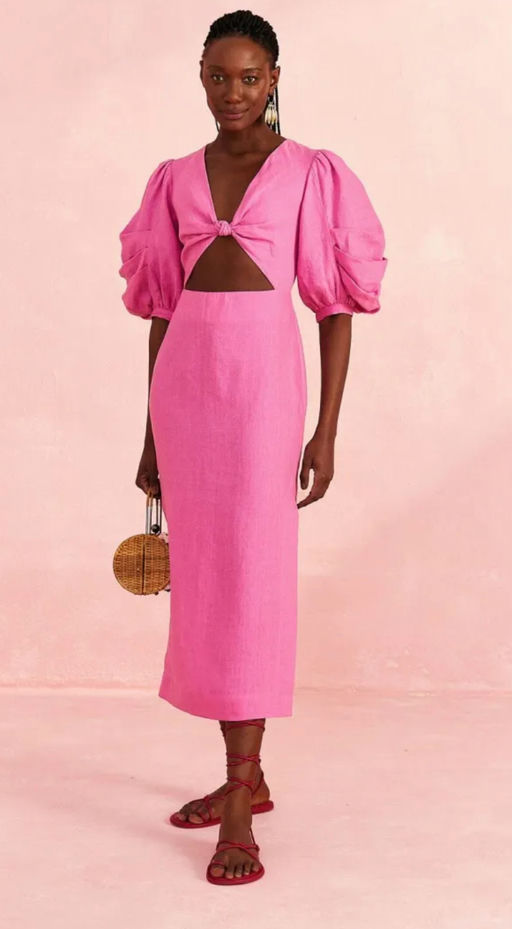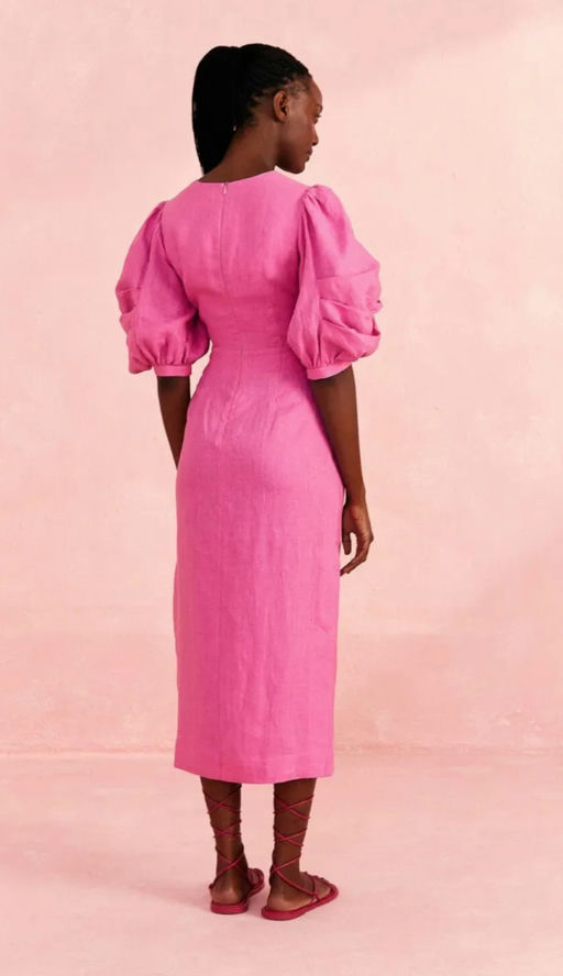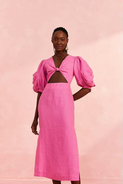 Linen Cut-Out Puff-Sleeve Midi-Dress